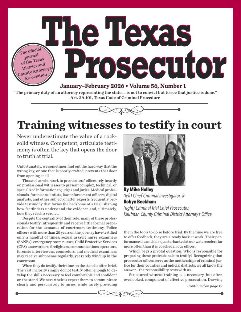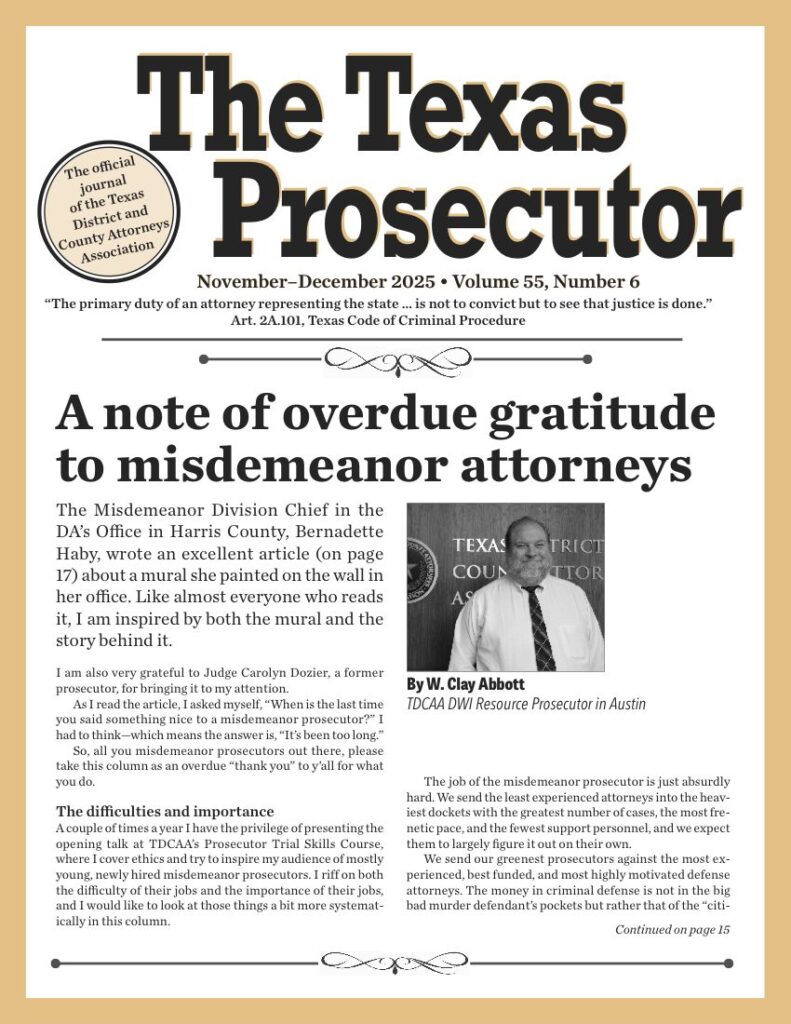 The Texas Prosecutor is the official journal of the Texas District and County Attorneys Association. It is published bimonthly and mailed to every prosecutor office employee in the state; it is also available online here.