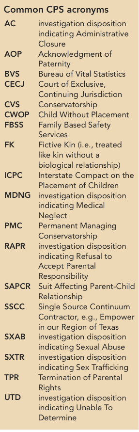 Clear as mud, right? For your convenience, I have listed some of the most common acronyms and abbreviations in CPS records in the sidebar below. If you would like additional resources to help you review CPS records, I will point you to the Texas Supreme Court Children’s Commission. It has created several helpful (and free!) bench books and attorney toolkits, including a more extensive glossary of CPS acronyms and abbreviations.[10]